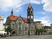 At the onset of World War II in September 1939, Poland was invaded by Germany and Nazi German occupation began. On September 6–8, 1939, the Einsatzgruppe II entered the town to commit various crimes against Poles.[13] Mass searches of Polish organizations, offices and houses,[14] and mass arrests of priests, teachers, intelligentsia and fighters of three anti-German, Silesian Uprisings (1919–1921) took place. The synagogue was burned while German minority enthusiastically welcomed invading Nazi forces. Already in September 1939, the Germans murdered over 20 Poles in the present-day districts of Lasowice, Strzybnica and Repty Śląskie.[15] Among the victims were miners, former insurgents and a school principal from nearby Chorzów.[15] Germany established and operated a prison for Poles in the town.[16] During the occupation, the Armia Krajowa (Home Army, the leading Polish underground resistance organization) undertook a sabotage campaign against Nazi forces, railroad-transport and local industry. The Germans operated two forced labour subcamps of the Stalag VIII-B/344 prisoner-of-war camp in the town.[17] Liberation of Silesia came in early 1945; in order to save the industrial infrastructure of the region, the Red Army opened an offensive supported by massive numbers of troops with minimal use of heavy artillery and air-bombardment. According to witnesses, the entire operation was extremely fast; countless, shoulder-to-shoulder, crowds of Russian soldiers passed through the town in matter of minutes followed by almost complete still.