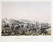 After the successful Second Serbian Uprising when Serbian prince Miloš Obrenović ordered the building of a new town around the old Kalemegdan fortress (Savamala neighborhood), he also ordered that the old Serbian cemetery from Varoš Kapija (near Zeleni Venac)[23] be moved to Tašmajdan, which was done in 1828.[13] New cemetery was intended as "international" contrary to the existing practice, so beside Serbs, it was also the burial place for Hungarians, Germans, Greeks, Italians and French.[24]