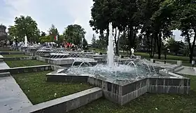 In June 2010, it was announced that the park will be completely reconstructed as a gift of Azerbaijan to Belgrade. The park has been reopened in June 2011 after throughout renovation, including the installation of a coloured fountain broadcasting classical music. As a sign of gratitude Belgrade has erected a monument to the former president of Azerbaijan Heydar Aliyev in the park.[46] Reconstruction included the rebuilding of the paths, removal of sick trees and planting of new ones, construction of two children playgrounds and a special area for the pensioners. Two public toilets and park infrastructure were renovated, the video surveillance system was installed and the statue of the writer Milorad Pavić was erected.[23] The star-shaped fountain, patterned after a similar one in Barcelona, was closed in 2020, and fully renovated by September 2021.[47]