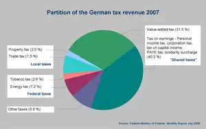 Most of the revenue is earned by income tax and VAT. The revenues of these taxes are distributed between the federation and the states by quota. The municipalities receive a part of the income of the states. In addition, there is a compensation between rich and poor states (Constitution, Art. 107).