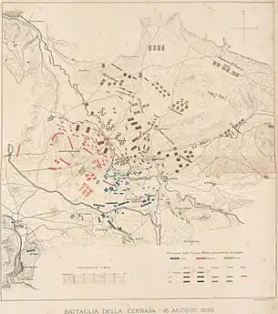 The Battle of the Chernaya (also Tchernaïa; Russian: Сражение у Черной речки, Сражение у реки Черной, literally: Battle of the Black River) was a battle by the Chyornaya River fought during the Crimean War on August 16, 1855. The battle was fought between Russian troops and French and Piedmontese troops. The Chyornaya River is on the outskirts of Sevastopol. The battle ended in a Russian retreat and a victory for the French and Piedmontese.