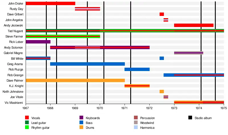After a member shuffle for signing a deal with Mainstream Records of New York City, the personnel on their debut album, The Amboy Dukes, were: