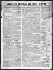 Telegraph and Texas Register (1835–1877) was the second permanent newspaper in Texas. Originally conceived as the Telegraph and Texas Planter, the newspaper was renamed shortly before it began publication, to reflect its new mission to be "a faithful register of passing events".[1] Owners Gail Borden, John Pettit Borden, and Joseph Baker founded the paper in San Felipe de Austin, a community long at the center of Texas politics.[2] The first issue was printed on October 10, 1835, days after the outbreak of the Texas Revolution. The Telegraph continued to report news of the war and the formation of the new Republic of Texas through the end of March 1836. As the Mexican Army approached the colonies in eastern Texas, most residents fled eastward. The owners of the Telegraph and their printing press evacuated on March 30 with the rear guard of the Texian Army. The press was quickly reestablished in Harrisburg. On April 14, Mexican soldiers captured the printing press and threw it into Buffalo Bayou.