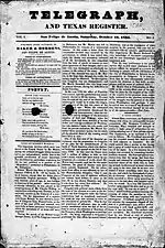 ![]() Inaugural edition of the Telegraph and Texas Register, published October 10, 1835 | |