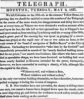 Although Burnet had expected the 1st Congress to name Columbia the capital, they instead chose a brand-new city, Houston.[27] The new capital had only been founded on August 30, 1836 and the land was still being surveyed at the time of its elevation to capital.[31] Houston and Columbia were separated by 50 miles (80 km) of boggy river bottoms. It was very difficult to transport large loads overland, so publishers made arrangements to ship the printing press via boat.[32] On April 16, 1837, the press arrived in Houston, on the same boat as the executive departments of the Republic of Texas.[33] The first issue to be printed in Houston appeared on May 2, 1837.[28]