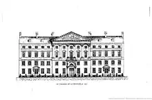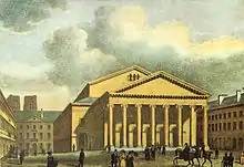 The first permanent public theatre for opera performances of the court and City of Brussels was built between 1695 and 1700 by the Venetian architects Paolo and Pietro Bezzi, as part of a rebuilding plan following the bombardment of Brussels of 1695 by the French army. It was erected on the site of a building that had served to mint coins. The name of this site—La Monnaie (originally spelled La Monnoye[1]) in French or De Munt in Dutch (both meaning "The Mint")—remained attached to the theatre for the centuries to come. The construction of the theatre had been ordered by Maximilian II Emanuel, Elector of Bavaria, at that time Governor of the Habsburg Netherlands.[3] The Elector had charged his treasurer and architect, the Italian Gio Paolo Bombarda, with the task of financing and supervising the enterprise.