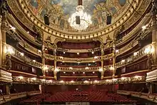 The lavish decoration made excessive use of gilded carton-pierre decorations and sculptures, red velvet and brocade. The auditorium was lit by a huge crystal chandelier made of gilded bronze and Venetian crystals, which still hangs in the centre of the domed ceiling today.