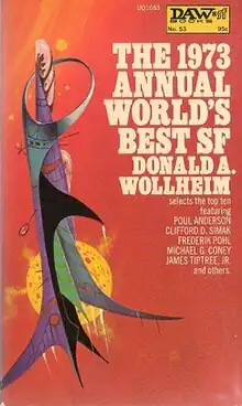 The 1973 Annual World's Best SF is an anthology of science fiction short stories edited by Donald A. Wollheim and Arthur W. Saha, the second volume in a series of nineteen. It was first published in paperback by DAW Books in May 1973, followed by a hardcover edition issued in August of the same year by the same publisher as a selection of the Science Fiction Book Club. For the hardcover edition the original cover art of Jack Gaughan was replaced by a new cover painting by William S. Shields. The paperback edition was reissued by DAW in December 1978 under the variant title Wollheim's World's Best SF: Series Two, this time with cover art by Larry Oritz.