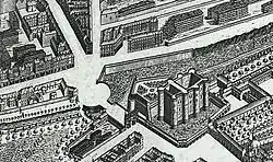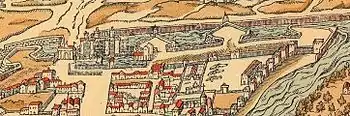 During the 16th century the area around the Bastille developed further. Early modern Paris continued to grow, and by the end of the century it had around 250,000 inhabitants and was one of the most populous cities in Europe, though still largely contained within its old city walls – open countryside remained beyond the Bastille.[32] The Arsenal, a large military-industrial complex tasked with the production of cannons and other weapons for the royal armies, was established to the south of the Bastille by Francis I, and substantially expanded under Charles IX.[33] An arms depot was later built above the Porte Saint-Antoine, all making the Bastille part of a major military centre.[34]