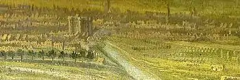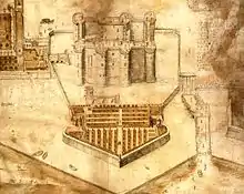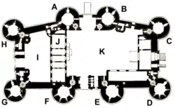 Structurally, the late-18th century Bastille was not greatly changed from its 14th-century predecessor.[89] The eight stone towers had gradually acquired individual names: running from the north-east side of the external gate, these were La Chapelle, Trésor, Comté, Bazinière, Bertaudière, Liberté, Puits and Coin.[90] La Chapelle contained the Bastille's chapel, decorated with a painting of Saint Peter in chains.[91] Trésor took its name from the reign of Henry IV, when it had contained the royal treasury.[92] The origins of the name of Comté tower are unclear; one theory is that the name refers to the County of Paris.[93] Bazinière was named after Bertrand de La Bazinière, a royal treasurer who was imprisoned there in 1663.[92] Bertaudière was named after a medieval mason who died building the structure in the 14th century.[94] Liberté tower took its name either from a protest in 1380, when Parisians shouted the phrase outside the castle, or because it was used to house prisoners who had more freedom to walk around the castle than the typical prisoner.[95] Puits tower contained the castle well, while Coin formed the corner of the Rue Saint-Antoine.[94]