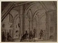 The main castle courtyard, accessed through the southern gateway, was 120 feet long by 72 feet wide (37 m by 22 m), and was divided from the smaller northern yard by a three-office wing, built around 1716 and renovated in 1761 in a modern, 18th-century style.[96] The office wing held the council room that was used for interrogating prisoners, the Bastille's library, and servants' quarters.[97] The upper stories included rooms for the senior Bastille staff, and chambers for distinguished prisoners.[98] An elevated building on one side of the courtyard held the Bastille's archives.[99] A clock was installed by Antoine de Sartine, the lieutenant general of police between 1759 and 1774, on the side of the office wing, depicting two chained prisoners.[100]