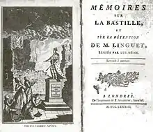 In the 1780s, prison reform became a popular topic for French writers and the Bastille was increasingly condemned as a symbol of arbitrary despotism.[150] Two authors were particularly influential during that period. The first was Simon-Nicholas Linguet, who was arrested and detained at the Bastille in 1780, after publishing a critique of Maréchal Duras.[151] After his release, he published his Mémoires sur la Bastille in 1783, a damning critique of the institution.[152] Linguet criticised, sometimes inaccurately, the physical conditions in which he was kept, but went further by capturing in detail the more psychological effects of the prison regime upon an inmate.[153][upper-alpha 16] Linguet also encouraged Louis XVI to destroy the Bastille, publishing an engraving depicting the king announcing to the prisoners "may you be free and live!", a phrase borrowed from Voltaire.[144]