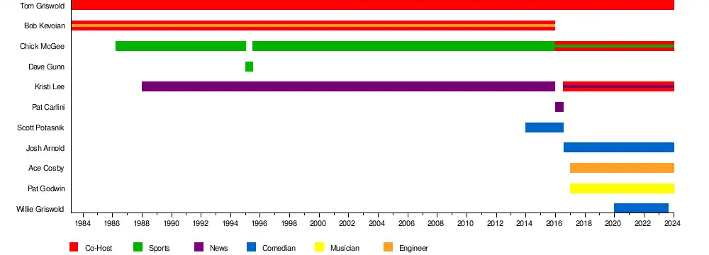 For most of The Bob & Tom Show's 40 year history, the cast consisted of hosts Bob Kevoian and Tom Griswold, sports commentator and comic foil Chick McGee, news director Kristi Lee, and producer Dean Metcalf. Kevoian and Griswold originally teamed up in the early 1980s at Petoskey, Michigan station WJML[15] before being lured to WFBQ "Q95" Indianapolis in 1983 to host what was initially a music-heavy morning show.[16] Marty Bender then arrived as both Program Director and contributor. After McGee (in 1986) and Lee (in 1988) joined the show, the primary cast that listeners would know for decades simply as "Bob, Tom, Chick, and Kristi" was set.