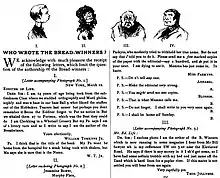 Tiring of the guessing game, some newspapers descended to satire. The New Orleans Daily Picayune surveyed the lengthy list of candidates and announced that "the authors of The Bread Winners [sic] will all meet at Chautauqua next summer."[44] Another columnist suggested that a statistic be put in the next census for the number of people named as the author.[45] The appearance of President Arthur's annual message to Congress in December 1883 caused the Rochester Herald to opine that he had written The Bread-Winners "because a careful comparison of his message with the story shows many words common to both".[46] Another Upstate New York paper, the Troy Times, evoked Parson Weems's tales of George Washington: "We cannot tell a lie. We wrote The Bread winners [sic] with our own little hatchet. If any one doubts it, we can show him the hatchet."[46] This admission, the Buffalo Express felt, should put an end to the discussion.[46]