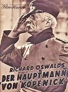 The Captain from Köpenick (German: Der Hauptmann von Köpenick) is a 1931 German comedy film directed by Richard Oswald and produced by Gabriel Pascal. It is one of several films based on the 1931 play of the same name by Carl Zuckmayer.[1] The story centers on the Hauptmann von Köpenick affair in 1906.
