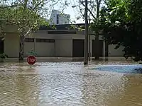 A local newspaper reported on June 11, 2008, that water exceeded the emergency spillway at the Coralville Reservoir outside of Iowa City.[14] As a result, the City of Iowa City and the University of Iowa were seriously affected by unprecedented flooding of the Iowa River, which caused widespread property damage and forced evacuations in large sections of the city.[15] By Friday, June 13, 2008, the Iowa River had risen to a record level of 30.46 feet (9.28 m) (5:00 pm CST) with a crest of approximately 33 feet (10 m) predicted for Wednesday, June 18, 2008. Much of the city's 500-year floodplain saw mild to catastrophic effects of the rapidly flowing, polluted water. Officials at the University of Iowa reported that up to 19 buildings were affected by rising waters. Extensive efforts to move materials from the university's main library were undertaken as large groups of sandbagging volunteers began to construct a massive levee near the building. Approximately $300 million worth of art, including work by Picasso, owned by the university was secretly moved to a holding place in the Chicago area before the fine arts area was heavily hit with flood water.
