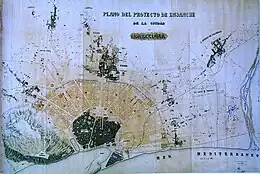 • Other projects: The project of Josep Massanès and that of José María Planas proposed a mere extension while maintaining the wall around the new space. The latter had a similarity with the project presented by the "owners of the Paseo de Gracia" since both projects were based on a mere extension on both sides of the Paseo de Gracia. Two other simpler projects were that of Tomás Bertrán Soler, who proposed a new neighborhood in place of the Citadel, converting the Passeig de Sant Joan into an axis similar to the Rambla; and a very elementary one attributed to Francisco Soler Mestres, who died three days before the reading of the prizes.[19]