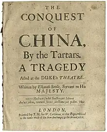 The Conquest of China by the Tartars is a 1675 tragedy by the English writer Elkanah Settle.[1] It was originally performed by the Duke's Company at the Dorset Garden Theatre in London.