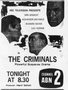 The Criminals is a 1962 Australian TV movie. Australian TV drama was relatively rare at the time.[3]