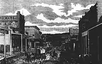 In 1838 a branch of Jason Lee's Methodist Mission was established at Celilo Falls, named the Wascopam Mission, after the native Wasco Indians.[9] In 1850 the U.S. Army founded a small post at the site of the old mission, being eventually named Fort Dalles. Fort Dalles became the nucleus of the town of The Dalles, which began to develop along the waterfront.[9] In 1855, at the end of the Cayuse War, the Indians living near The Dalles were forcibly relocated by the U.S. Army to the Warm Springs Indian Reservation.[9]