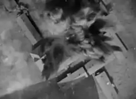 The scene in which Scott takes off with Courtney clinging to the wing switches to a shot of a Travel Air 4U Speedwing fitted with a round cowl over its Comet engine to resemble the Nieuports. Stunt pilots included Leo Nomis, Rupert Symes Macalister, Frank Tomick and Roy Wilson.[10] Several Thomas-Morse S-4 aircraft were used in the 1930 film. The S-4 was an American built fighter aircraft that did not see combat in World War I. Plentiful in 1930, the S-4s were becoming rare by the time the 1938 film was produced, hence the re-use of aircraft sequences from the original film. Some in-flight scenes with principal actors were staged with aircraft hoisted up by wires to a height of 25 feet. Stage hands then rocked the aircraft to simulate flight, but when one of the wires snapped, on screen, Barthelmess appeared startled, unaware that an accident had occurred, and simply thought the swaying aircraft was part of the scene.[11]