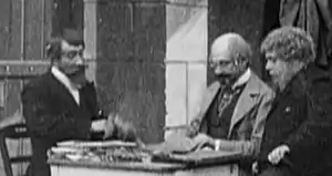 An ironworker with a strong resemblance to Dreyfus was hired for the role in order to increase the series's realism.[14] Méliès himself appears in the series as Dreyfus's attorney Fernand Labori and makes a brief reappearance as a journalist after Labori's attempted assassination.[15] At least one scene, Dreyfus's exit from the courthouse, appears to have been modelled on a news photograph printed in the journal L'Illustration.[16] Méliès drew on both cinematic and theatrical special effects for the series: the lightning in Landing of Dreyfus at Quiberon was added to the scene using multiple exposure, while the rain and rocking motion of the boat were created with stage machinery.[17] The gun smoke in The Attempt Against the Life of Maitre Labori is a puff of poudre de riz, a cosmetic powder.[18]