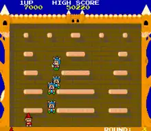 The Fairyland Story is a platform arcade game. The player controls the witch Ptolemy through a series of single-screen stages, with the objective being to defeat all of the enemies on each screen. Ptolemy's main weapon is her projectile magic, which will temporarily transform the enemies into large cakes.[1] While in a "caked" form, the enemies can be destroyed either by further magic attacks or by being dropped off a platform, possibly squashing other enemies below.[1] Squashing more than one enemy results in an award of more points and, sometimes, in extra bonuses. 2000 points are awarded for squashing an enemy below a cake, with each additional enemy doubling the number of points awarded.[1] If two or more enemies are killed at once in one spot, a coin will appear in that spot, which may be collected for additional points, and if more are collected, will multiply in points, so as long the player doesn't lose a life.[1]