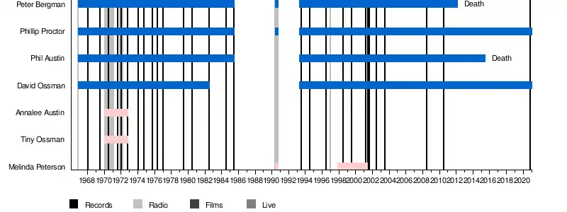 Austin's first wife Annalee performed in support of the group on several golden age albums. She is credited as a member of "the St. Louis Aquarium Choraleers" (singing the hymn "Marching to Shibboleth") and as "the Wake-Up Lady" and for birdsong on Don't Crush That Dwarf; as "Mickey" and with keyboard stylings on I Think We're All Bozos; with film footage on the Dear Friends album; and organ, piano, and vocals on Not Insane.
