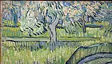 The period in which he painted The Gardener corresponds to the years when the landscape and the sun of Provence fascinated Van Gogh, when he created the series of olive trees and the paintings dedicated to cypresses and grain fields.[7][31] In the last part of the painting, the vegetation of bushes and plants merges with the meadow, giving the sensation that the grass is developing in tandem with the branches of the trees. The brushstroke is intense yet softly drawn, curved and elegant,[30] taking up technical solutions already experimented with in landscapes painted outdoors,[31][32] to achieve an idea of movement,[7] until ending at the top of the painting, where the rest of the plants and two small walls are present in the distance.
