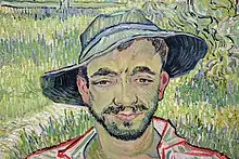 Although the work is often known by the title The Gardener, this is in fact a fairly recent title, which does not fully express the theme or message of the work.[4] It is a title probably inspired by the background of the painting which, rather than recalling a cultivated field, resembles a garden. Instead, other hypotheses hold that the title derives from the possibility that it is the portrait of the gardener of the psychiatric hospital of Saint Rémy, where Vincent van Gogh was a patient between April 1889 and May 1890.[7][8]