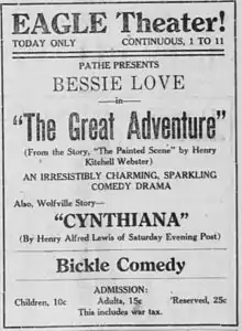 - ↑ "First Bessie Love Pathe Released March 10". Motion Picture News. March 9, 1918. p. 1448.