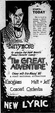The Great Adventure is a 1921 American silent romantic comedy film produced by Whitman Bennett and distributed by First National Pictures, then called Associated First National. The film was directed by Kenneth Webb and starred Lionel Barrymore. Fredric March made his screen debut in this film. The film is based upon the 1908 novel Buried Alive by Arnold Bennett. It was remade in 1933 as His Double Life starring Lillian Gish. The Great Adventure is a surviving feature film held by the Library of Congress.[1][2][3][4]