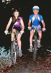 Patty Mooney[2] and Mark Schulze, an early user of the Helmet camera, learned about the sport of Mountain biking while in Canada in 1986. In 1987, the couple produced the mountain biking video, The Great Mountain Biking Video.[3][4][5] The video featured mountain-bike racing professionals Ned Overend, Martha Kennedy, John Tomac, Julia Ingersoll, Tinker Juarez, Trials rider, Kevin Norton and Olympian John Howard (cyclist) who instructed viewers on how to properly ride a mountain bike.
