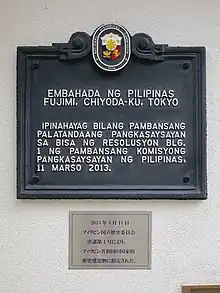 - ↑ "Phl embassy in Tokyo named nat'l historical landmark". The Philippine Star. Archived from the original on 22 November 2015. Retrieved 22 November 2015.