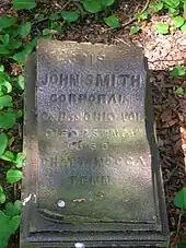 An unusual memorial is located next to the ruins of the Bishop's Palace or Castle of Montgreenan. The memorial is formed from glazed fireclay much like that used for wall coping stones and pipes and has the appearance of a corbel laid horizontally. The oblong structure has crossed canons at one end and bunches of olive or laurel leaves at the other end. The scroll on the upper surface reads "3219 – John Smith – Corporal – Co. B. 10th Ohio Vol – Died 25th Novr – 1863 – Chattanooga – Tenn". It appears therefore that John died whilst fighting in the Chattanooga Campaign of November 1863 and being in the Ohio Volunteers he was on the Union side and not a Confederate soldier. It can be surmised that John Smith had a close link with the Montgreenan estate.