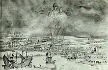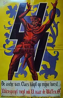 In the 1940s Ray Goossens made a gag-a-day comic about Uilenspiegel and Lamme Goedzak.[1] Willy Vandersteen drew two comic book albums about Uilenspiegel, "De Opstand der Geuzen" ("The Rebellion of the Geuzen") and "Fort Oranje" ("Fort Orange"), both drawn in a realistic, serious style and pre-published in the Belgian comics magazine Tintin between 1952 and 1954. They were published in comic book album format in 1954 and 1955. The stories were drawn in a realistic style and in some instances followed the original novel very closely, but sometimes followed his own imagination more.[2] Dutch comics artist George van Raemdonck adapted the novel into a comic strip in 1964.[3]