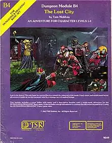 The Lost City (B4) is a Dungeons & Dragons adventure module by Tom Moldvay.[1] It was first published by TSR in 1982 and was designed as a stand-alone adventure for use with the Dungeons & Dragons Basic Set. The working title for the module was "The Lost City of Cynidicea".[2] Moldvay designed the module as a low-level scenario to give novice Dungeon Masters experience in fleshing out adventures such that it is only partially complete. The plot involves the player characters discovering a ruined subterranean city slowly rising out of the sands.[3] The adventure is set inside a huge step pyramid, with the lower pyramid only sketched out and the city itself described with a list of the major areas and a map. The adventure's main villain is Zargon, a giant one-eyed monster and his minions. The entire double pyramid, not including the city, contains over 100 rooms.