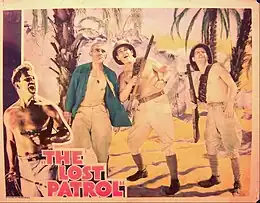 The Lost Patrol is a 1934 American pre-Code war film by RKO, directed and produced by John Ford, with Merian C. Cooper as executive producer and Cliff Reid as associate producer from a screenplay by Dudley Nichols from the 1927 novel Patrol by Philip MacDonald. Max Steiner provided the Oscar-nominated score. The film, a remake of a 1929 British silent film,[2] starred Victor McLaglen, Boris Karloff, Wallace Ford, Reginald Denny, J. M. Kerrigan and Alan Hale.[Note 1]