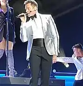 Warren Carlyle was signed as the creative director for the show, while Ashley Wallen choreographed the dancers through intricate dance steps.[20] The large main stage was elevated and set up at the end of the arenas, with a long runway extending from its middle, the pathway ended into a round-shaped front.[21] The tour featured costumes from Tom Ford including, a black snake-print velvet jacket, a metallic silver jacket and an ensemble of white shirt with pleated bib, silk-satin cummerbund and black fedora.[22][23][24][25][26]