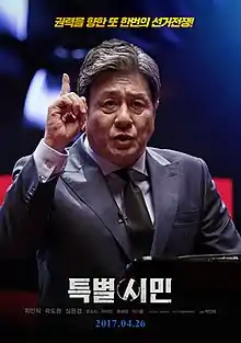 The Mayor (Korean: 특별시민; Hanja: 特別市民; RR: Teukbyeolsimin, lit. "Special Citizen") is a 2017 South Korean political drama film written and directed by Park In-je. It stars Choi Min-sik, Kwak Do-won, Shim Eun-kyung, Moon So-ri, Ra Mi-ran, Ryu Hye-young, and Ki Hong Lee.[2] The film was released in South Korea on April 26, 2017 and in the US and Canada on April 28.[3][4][5]