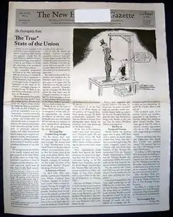 Published every two weeks as a smaller format broadsheet, usually of 14–20 pages, the Gazette's front page is usually an editorial called "The Fortnightly Rant", covering a few subjects of national or regional importance, accompanied by a political cartoon by Mike Dater reflecting the editorial. The motto of the newspaper is the motto of the state of New Hampshire, Live free or die.