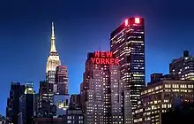 The western facade contains a sign with the name "New Yorker" in 21 ft-high (6.4 m) capital letters.[12][13] The original sign was illuminated from 1941 to 1967.[13] The sign was dark until 2005, when it was replaced with an LED sign[14][15] manufactured by LED Solution of Kitchener, Ontario.[13] The sign can be seen from northern New Jersey, across the Hudson River to the west.[12][16] Each of the letters can be illuminated separately, allowing the sign to display various messages on special occasions such as celebrations.[16]