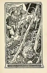 Against his desperate parent's wishes, the youngest son set out after the cat, which was called "The Nunda (Eater of People)" and could not find it for many days. Finally, he and his slaves tracked it over a mountain, through a great forest. The prince and slaves threw spears into it and ran away. The next day they carried it back to the town. The people and Sultan rejoiced because they had been delivered from the bondage of fear.