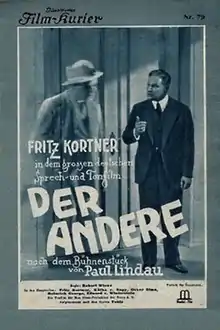The Other (German: Der Andere) is a 1930 German drama film directed by Robert Wiene and starring Fritz Kortner, Käthe von Nagy and Heinrich George. It was based on the 1893 play Der Andere by Paul Lindau. It was shot at the Terra Studios in Berlin.[1] A French-language version The Prosecutor Hallers was shot by Wiene immediately afterwards in the same Berlin studio, but with different actors.