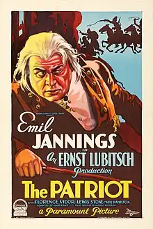 The Patriot is a 1928 sound part-talkie semi-biographical film that was directed by Ernst Lubitsch and released by Paramount Pictures. The film featured a synchronized musical soundtrack with sound effects along with some talking sequences using the Western Electric sound-on-film recording process. The movie is a biographical story of Emperor Paul I of Russia, starring Emil Jannings, Florence Vidor, and Lewis Stone.[1]