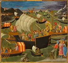 The painting is today recognized as the pendant of King Melchior Sailing to the Holy Land by Francesco Pesellino now in the Clark Art Institute of Williamstown, Massachusetts. Together with a yet unidentified painting, they may have formed the predella of a yet unidentified altarpiece. Strozzi's painting had at first been attributed to Domenico di Michelino by Bernard Berenson. It is attributed to Strozzi since 1950.[1][2]