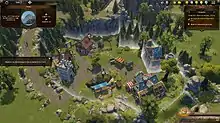 At this stage of development, the supply and demand-based city-building gameplay was similar to previous Settlers titles, involving economic micromangement, constructing and upgrading buildings, researching new technologies, and gathering resources, with an emphasis on building up a robust economic model, managing daisy-chain economic processes, navigating technology trees, and improving the player's settlement.[26] An innovation in the basic Settlers gameplay at this time was that when the player constructs a building, it is no longer automatically linked to other buildings or automatically assigned a role. So, for example, when the player builds a lumberjack, nothing will happen until the player manually assigns the occupant a section of forest in which to work.[27] Similarly, when the player builds a sawmill, it doesn't automatically form an economic chain with the lumberjack. Instead, the player must manually link the buildings, with each building capable of being linked with only one other building - so if the player has more than one sawmill and lumberjack, they must choose how to set up the buildings' interactions.[28] This was to be the case for production chains involving two buildings or many buildings - everything must be manually linked by the player, allowing a level of control not yet seen in the franchise.[29]