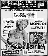 The Seven Year Itch is a 1955 American romantic comedy film directed by Billy Wilder, from a screenplay he co-wrote with George Axelrod from the 1952 three-act play. The film stars Marilyn Monroe and Tom Ewell, who reprised his stage role. It contains one of the most iconic pop-culture images of the 20th century – Monroe standing on a subway grate as her white dress is blown upwards by a passing train.[1] The titular phrase, which refers to a waning interest in monogamous relationship after seven years of marriage, has been used by psychologists.[2]