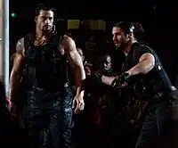 The Shield has from the beginning of their existence voiced their intentions to fight what they perceived as "injustice".[4] They were also known for their black ring attire (including protective vests) with each member having their own style,[22][23] their tendency to approach the ring through the live audience[24] and their trademark promos, which were recorded from a first-person perspective using a handheld camcorder.[25] They were a group which possessed teamwork and a willingness to sacrifice themselves as an individual for the good of the team,[26][27] which achieved victories by overwhelming opponents with superior numbers after incapacitating their teammates.[28] The Shield referred to WWE as their "yard" during their speeches[29][30] and were nicknamed as "The Hounds of Justice".[22]