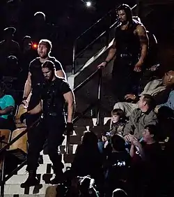 The Shield[7] was a professional wrestling stable in WWE that consisted of Dean Ambrose, Roman Reigns, and Seth Rollins. Their original characters were mercenaries for CM Punk; however, they quickly became mainstay main-event names.[8] The group debuted on November 18, 2012 at the Survivor Series pay-per-view.[5] The Shield was a dominant force in six-man tag team matches with an undefeated televised streak lasting from December 2012 to May 2013, during which they scored a victory at WrestleMania 29.[9] In May 2013 at Extreme Rules, all three members of The Shield won a championship, with Ambrose winning the United States Championship while Rollins and Reigns captured the WWE Tag Team Championship.[10] Rollins and Reigns were WWE Tag Team Champions until October 2013, and Ambrose was United States Champion until May 2014, which was a record reign for the WWE version of the championship.[11][12] As a Shield member, Reigns gained prominence by setting and equaling elimination records at the 2013 Survivor Series and the 2014 Royal Rumble events.[13][14]